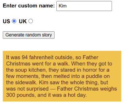 이 모듈에서 배운 지식들을 바탕으로 랜덤하게 꾸며진 이야기(silly stories)가 만들어지는 재미있는 앱을 만들어 볼거에요. 즐겨봅시다!
