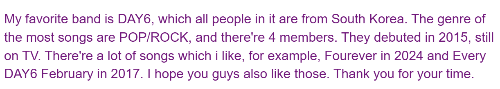 bandInfo = `My favorite band is ${band.name}, which all people in it are from ${band.nationality}. The genre of the most songs are ${band.genre}, and there're ${band.members} members. They debuted in ${band.formed}, still on TV. There're a lot of songs which i like, for example, ${band.albums[0].name} in ${band.albums[0].released} and ${band['albums'][1]['name']} in ${band['albums'][1]['released']}. I hope you guys also like those. Thank you for your time.`;